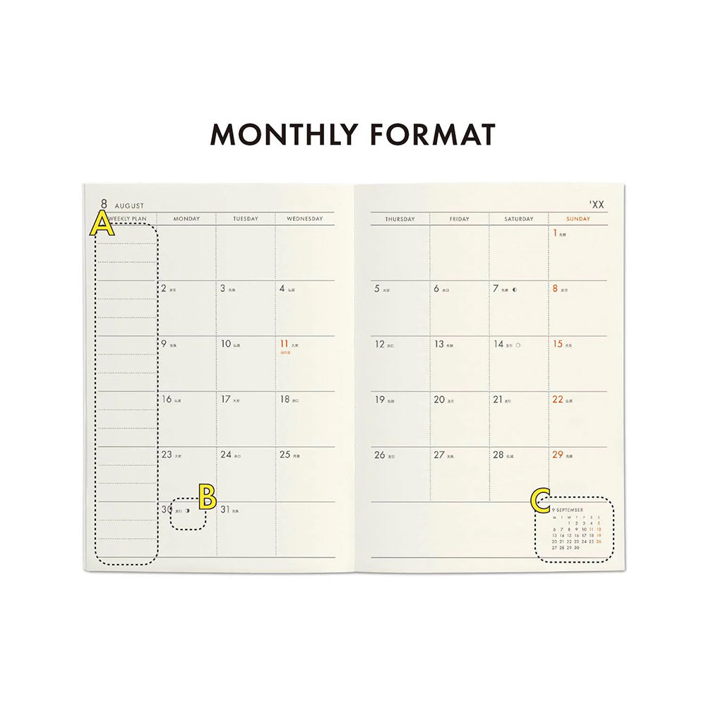 Content: Calendar, monthly schedule, weekly schedule, notes, personal data