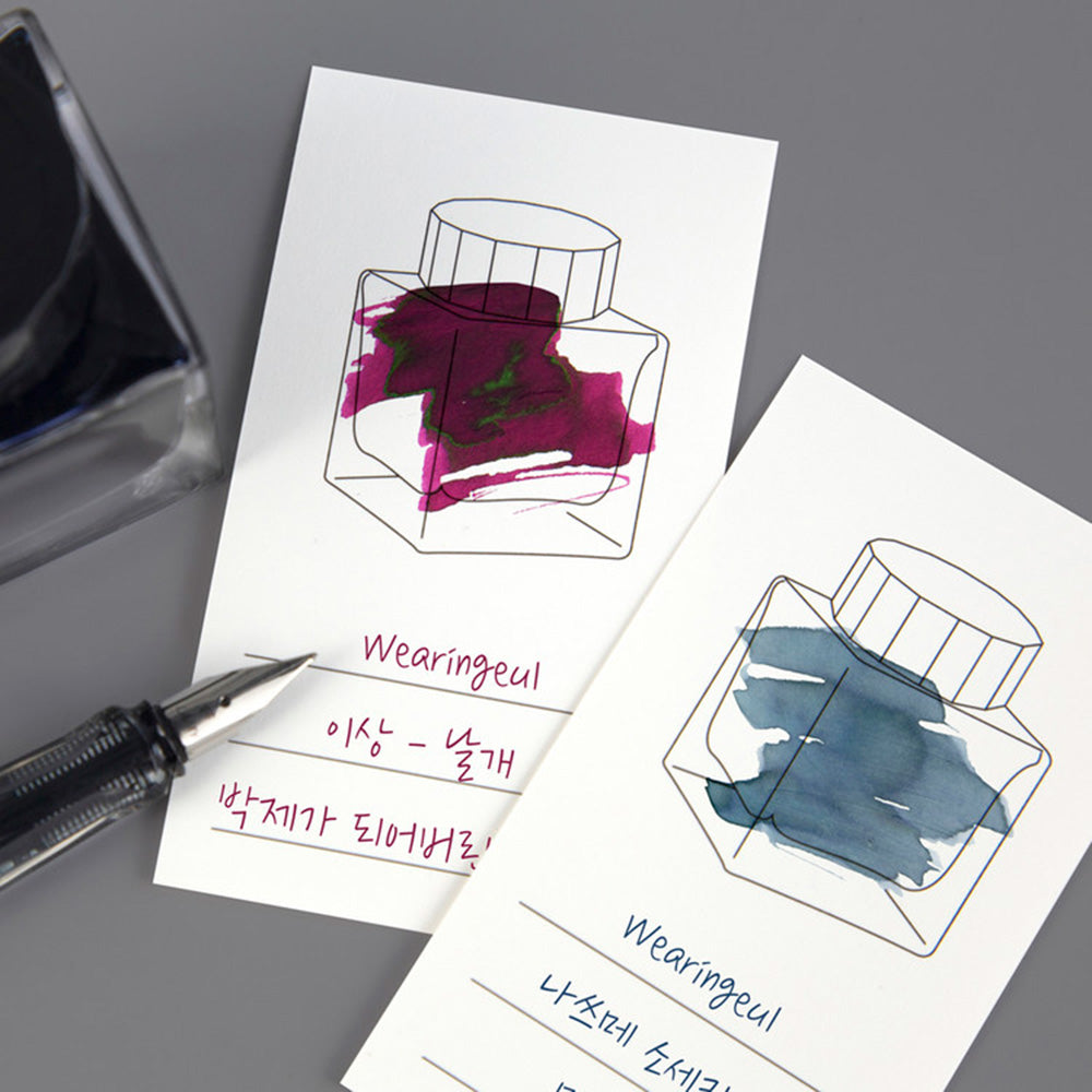 Wearingeul was established in 2016 by calligrapher Ahn Dong Hyuk who aspired to reinterpret famous literary works using various different senses. Their first product was the “Book Perfume” which sought to reinterpret literature through scent. Their inks seek to do so through sight, specifically color. Since their conception, Wearingeul has branched out to reinterpret contemporary literature as well as other media and created products such as ink swatch cards and fountain pen-friendly paper.