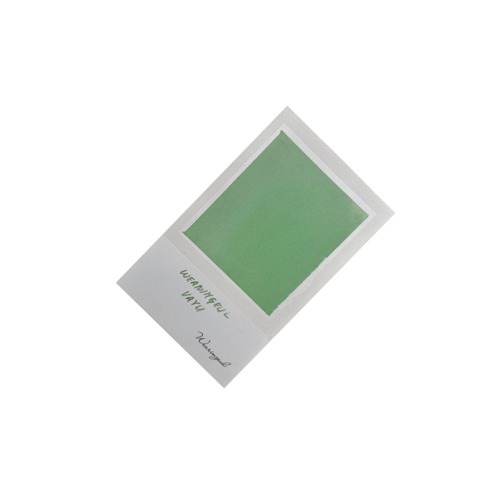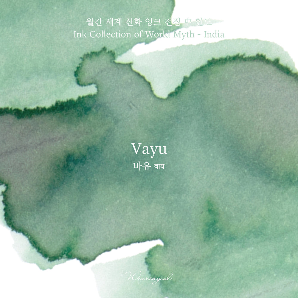 - Vayu is the god of wind and air in India. This ink illustrates the color of wind and air which are invisible, but can be felt. Based in a crystal clean emerald green base- soft pink appears as it dries.